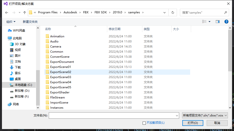 直接使用VS打开项目C:\Program Files\Autodesk\FBX\FBX SDK\2019.0\samples(这是默认安装目录~这个文件夹里面有一堆示例代码工程,可以打开学习)