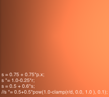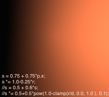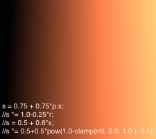 float s = 0.75 + 0.75 * p.x; s *= 1.0 - 0.4 * r; s = 0.3 + 0.7 * s; s *= 0.5 + 0.5 * pow(1.0 - clamp(r / d, 0.0, 1.0), 0.1); vec3 hcol = vec3(1.0, 0.4 * r, 0.3) * s; |