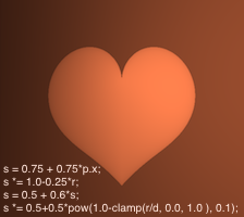 p.y -= 0.25; float a = atan2(p.x, p.y) / 3.141593; float r = length(p); float h = abs(a); float d = (13.0 * h - 22.0 * h * h + 10.0 * h * h * h) / (6.0 - 5.0 * h); |