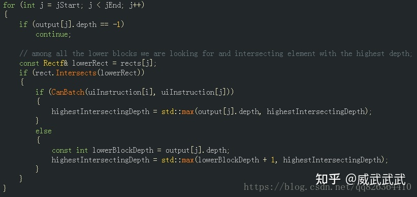 注意:在Depth计算算法中,由于要遍历所有UI元素和已计算的底层UI元素(平方复杂度),源码中使用分组计算包围盒矩形的方法加快计算,即16个UI元素为一组计算Group Rect,检查是否与底层UI元素相交时,先计算是否与底层Group相交,如果相交再与Group中的元素做判定。