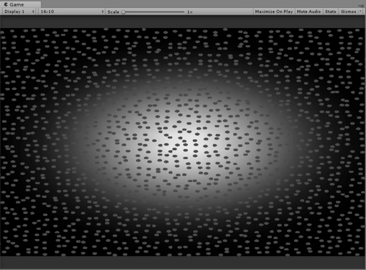 根据上述内容,区域中其它位置到水珠坐标的距离d作为模糊程度的判断依据,越靠近值越大。即:圆心处值为1,圆上圆外值为0。如此根据代码可以得到一个UV值分布图: